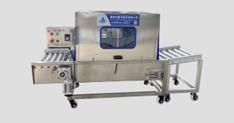 將消毒液體進行離分子霧化后輸入到霧化室,箱體經過霧化室時周身被霧化后的消毒液覆蓋從而達到消毒殺菌的效果,該設備配合消毒液對物品外包裝進行消毒滅菌。