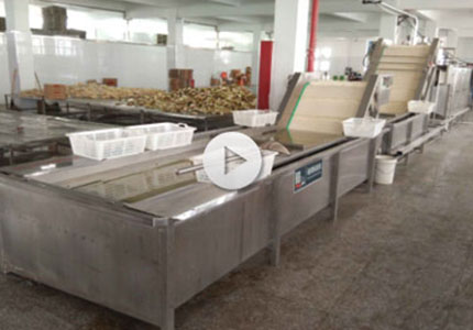 A葉菜類:收菜--分揀輸送--氣泡清洗(粗洗)--氣泡清洗殺菌機--噴淋清洗(凈洗)--風干瀝水--包裝輸送。